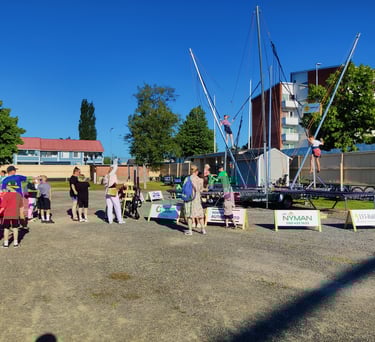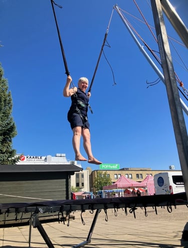 Me kasaamme ja puramme koko systeemin paikan päällä, opastamme jokaisen hyppijän alusta loppuun ja valvonta hoituu tarvittaessa meidän porukalla tai teidän omalla väellä. Turvallisuus on aina ykkösjuttu – vastuuvakuutus, laadukkaat varusteet ja tarkka valvonta pitävät homman hauskana ilman murheita.