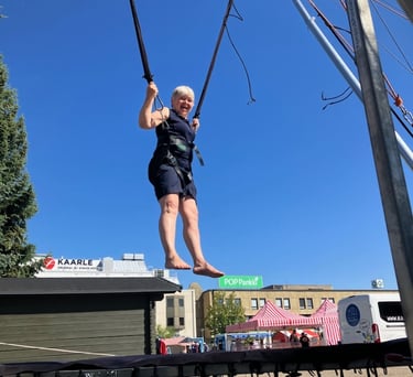 Meillä on neljä benji-trampoliinia yhdessä paketissa. Tarkoittaa sitä, että neljä pomppijaa pääsee hyppimään yhtä aikaa, ilman että kukaan joutuu jonottamaan ikuisuuksia.